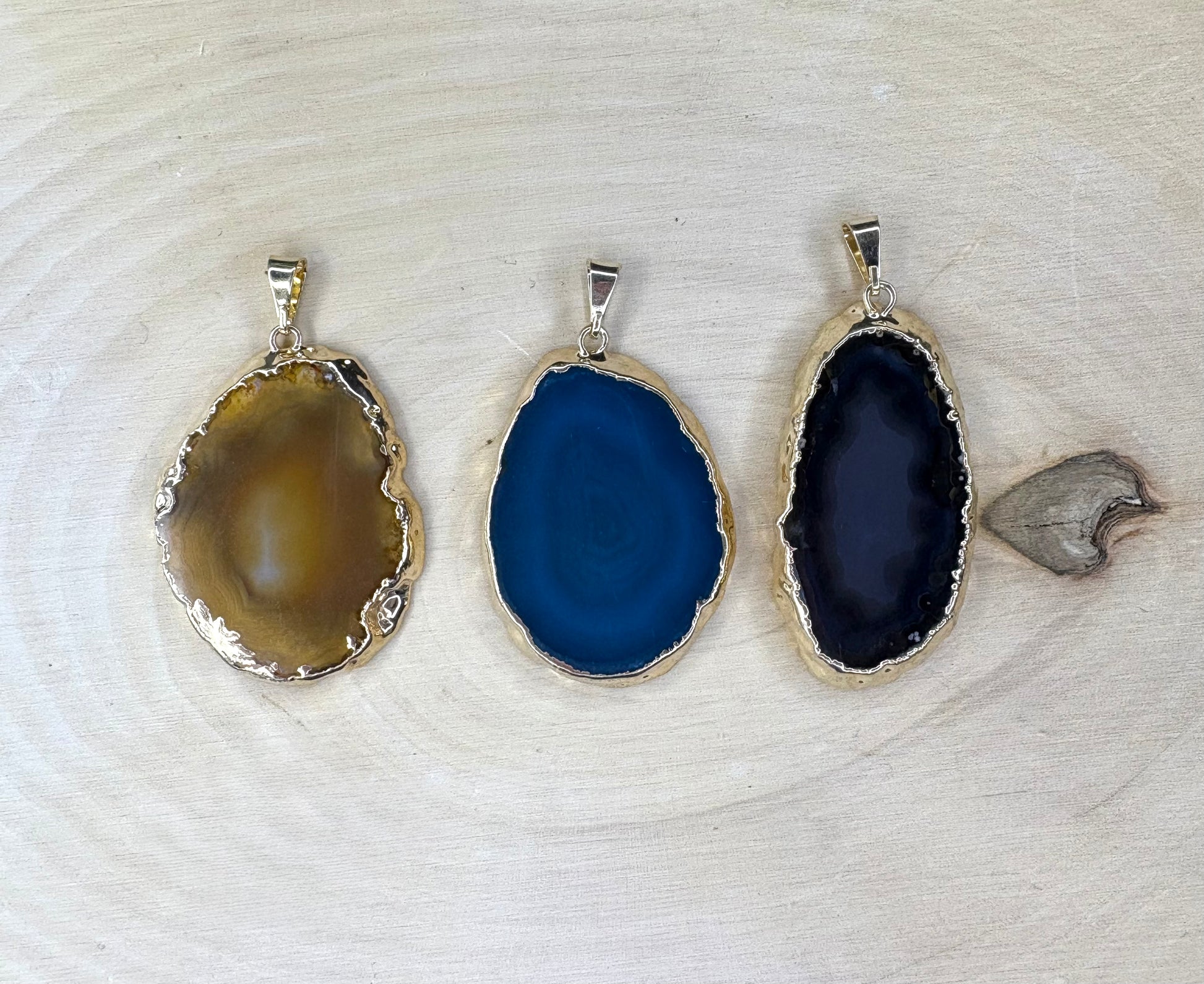 Agate Slice Pendant Necklace — Blue, Black & Brown Stones with 18K Gold Hand-Painted Edges