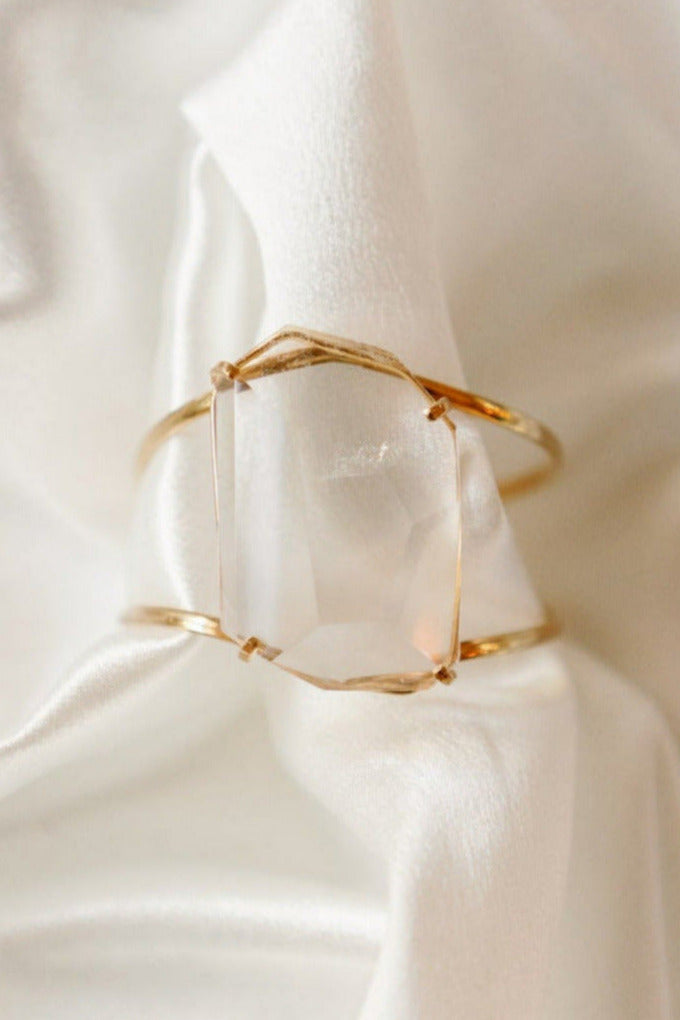 Embrace timeless elegance with our Clear Crystal Quartz Cuff Bracelet, a stunning piece handcrafted in Brazil. Featuring pristine crystal quartz set in hypoallergenic 18k gold plated, this bracelet is the epitome of sophistication and natural beauty.
