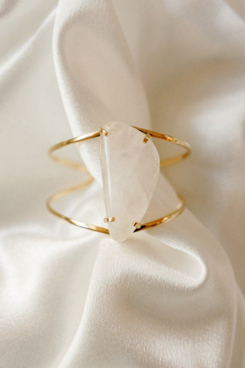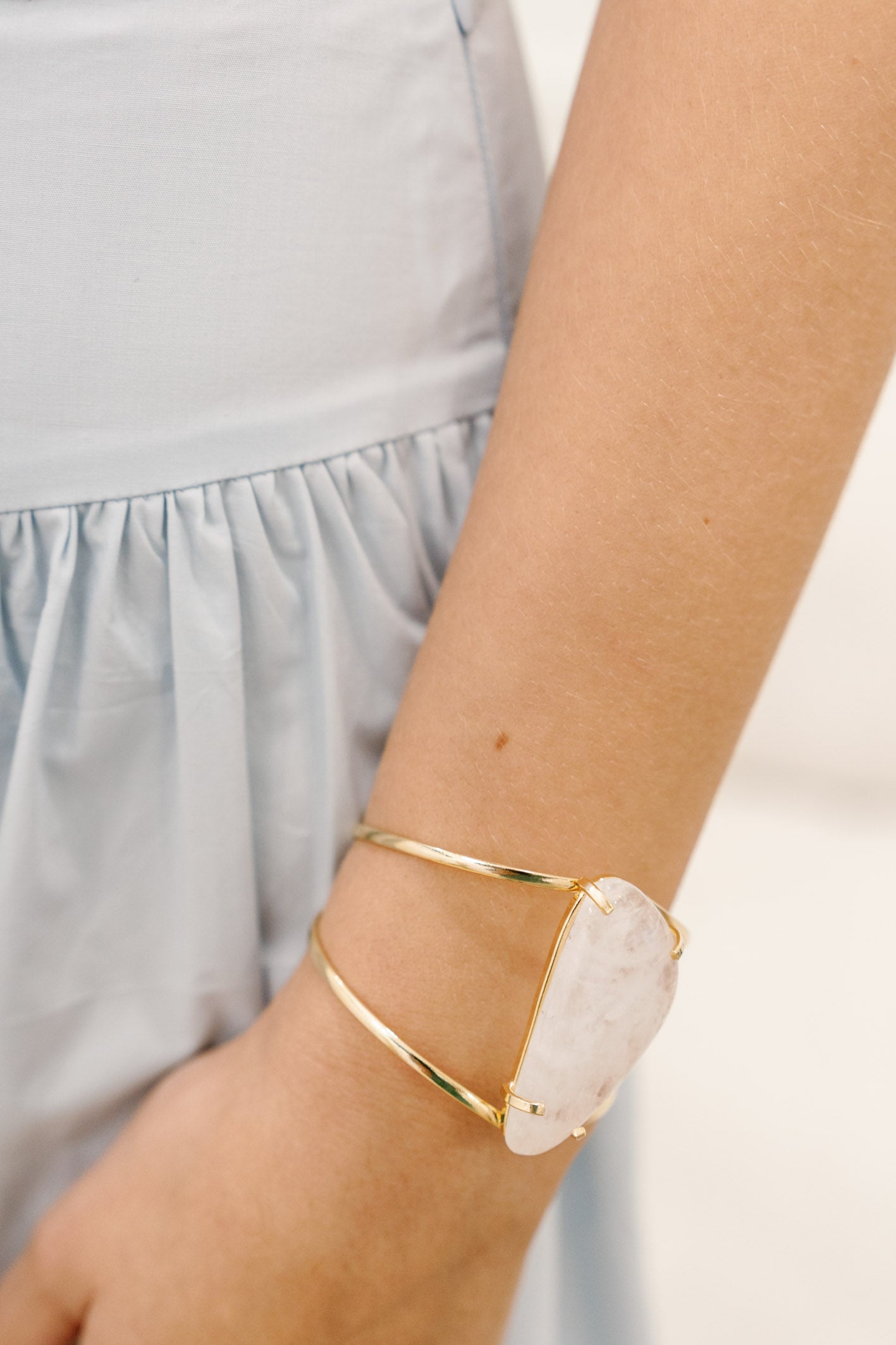 Clear Quartz Cuff Bracelet — 18K Gold Plated, Adjustable Natural Gemstone Jewelry, Hypoallergenic