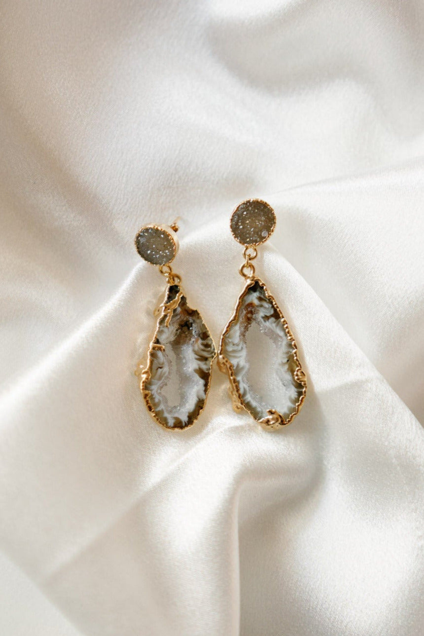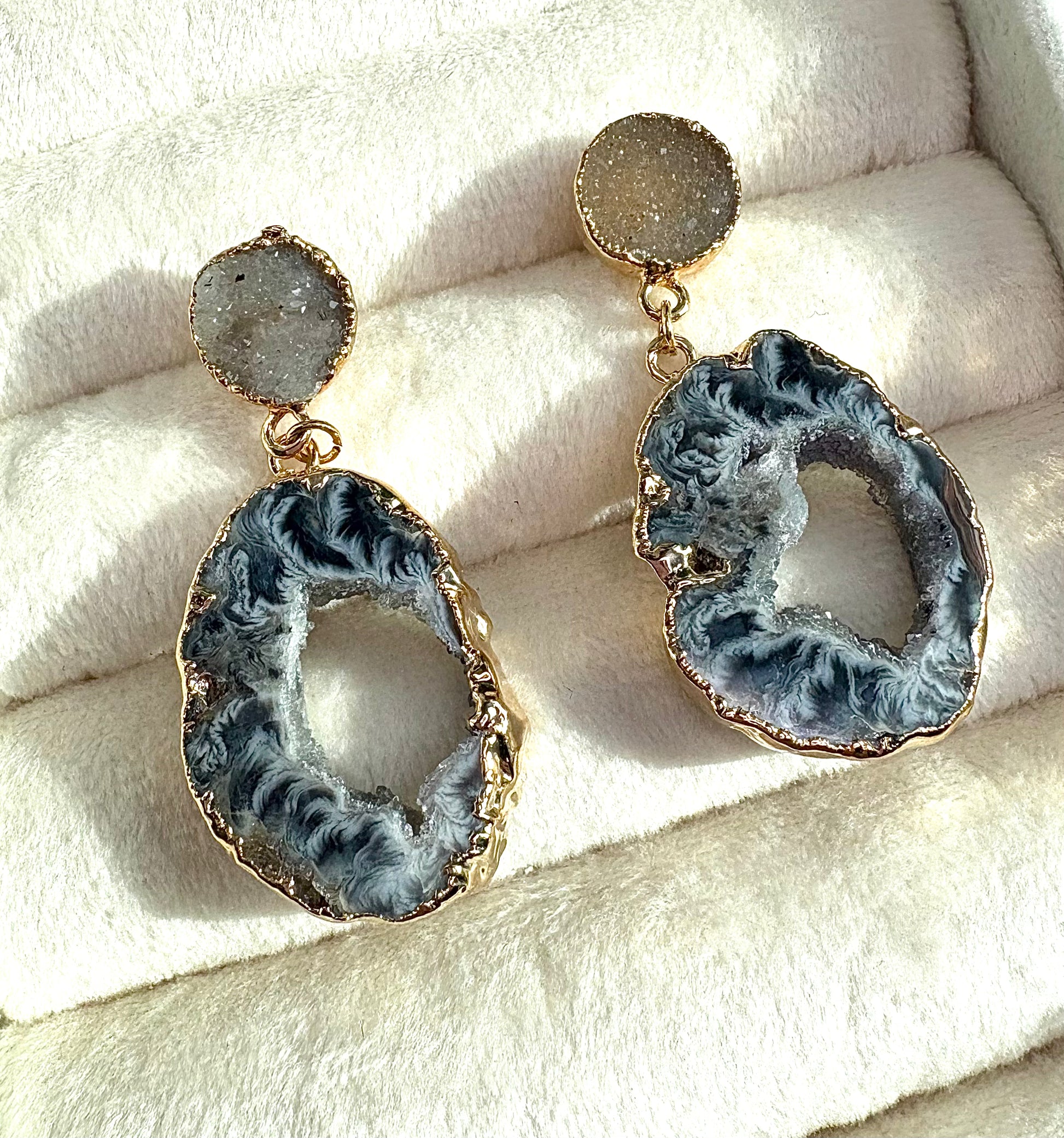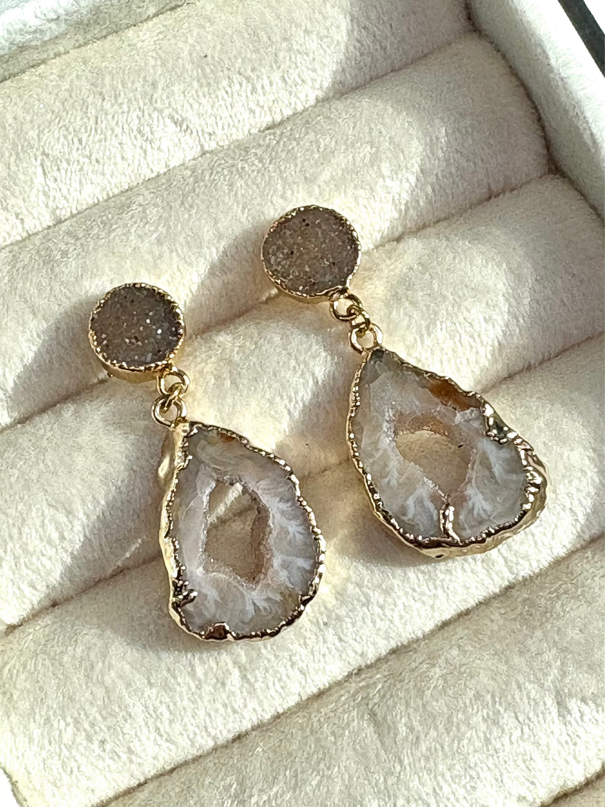 Druzy & Geode Dangle Earrings — 18K Gold Hand-Painted Edges, Hypoallergenic Natural Stone Jewelry