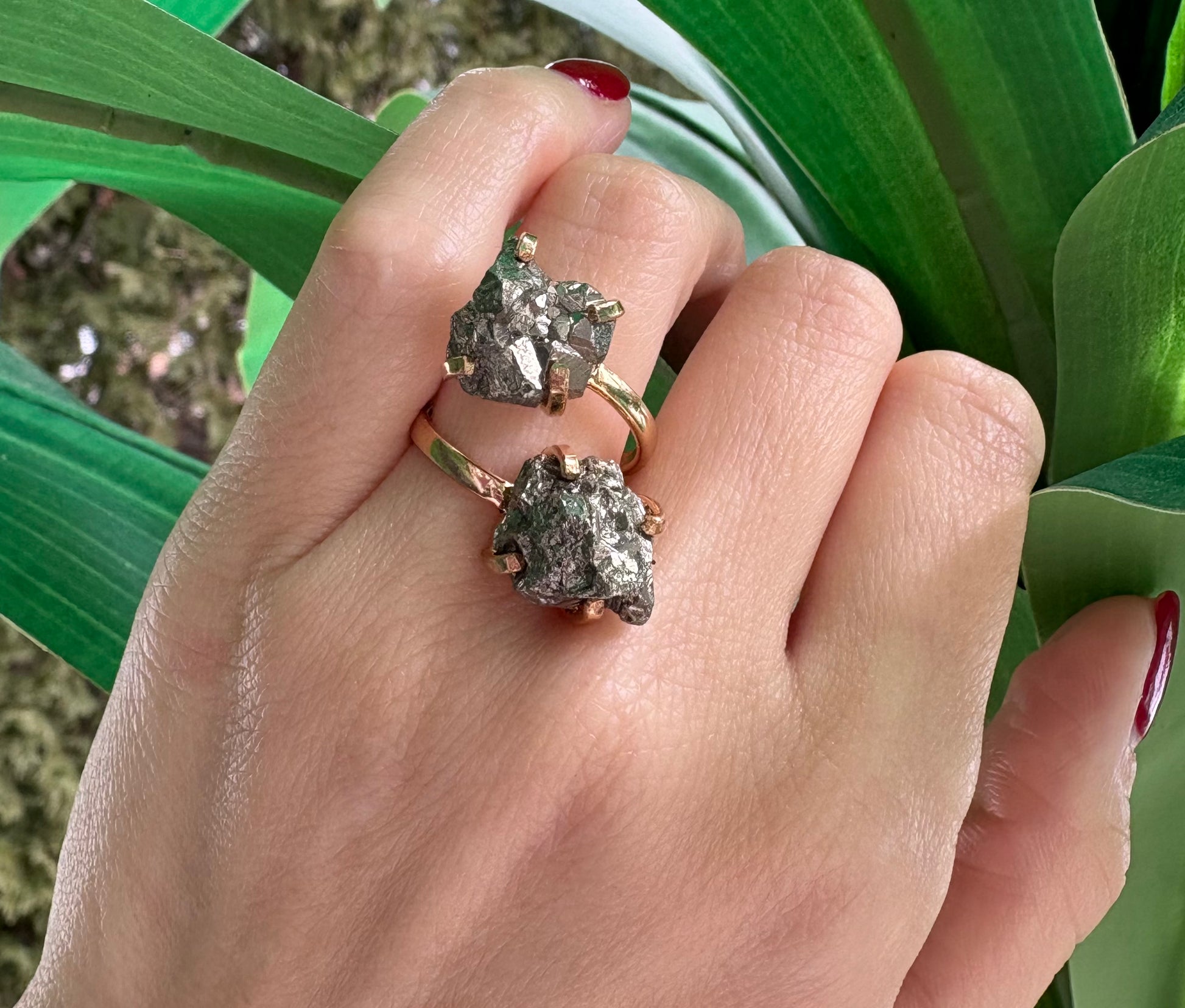 Enhance your collection with the Dual Pyrite Ring – a blend of natural beauty, luxury, and the powerful benefits of pyrite, all in one stunning piece.
