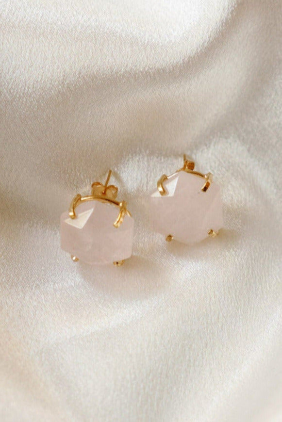 Rose Quartz Hexagon Statement Stud Earrings — 18K Gold Plated, Natural Gemstone Jewelry