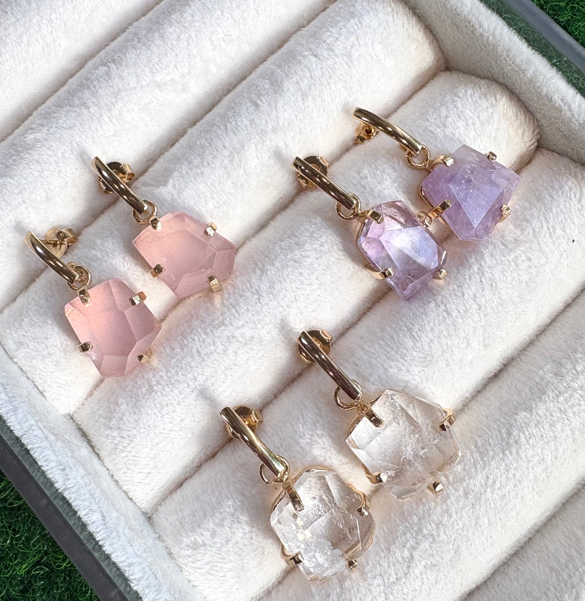 Discover the perfect balance of luxury and elegance with our Premium Faceted Gemstone Drop Earrings. Featuring a selection of stunning gemstones—Clear Quartz, Rose Quartz, and Amethyst—these earrings bring timeless beauty and sophistication to your jewelry collection. The faceted stones catch the light, creating a brilliant sparkle that enhances any outfit.