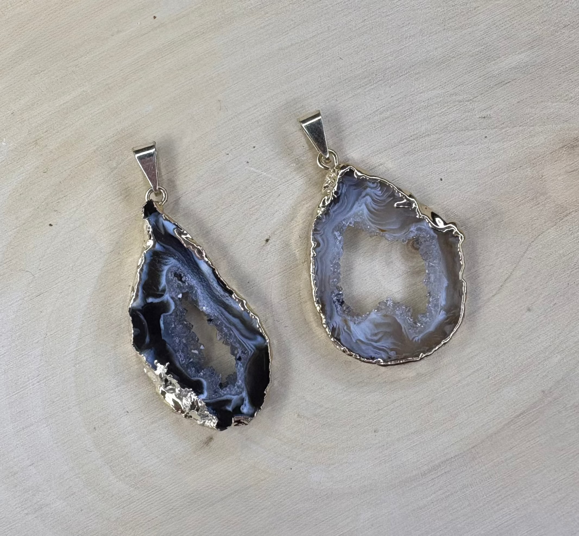 These pendants are truly one-of-a-kind, showcasing the unique formations and textures of each geode, while the 18K gold hand-painted edges add a sophisticated touch to the natural stone. Whether you’re drawn to the dramatic dark tones or the light, airy feel, these pendants bring an elegant balance of nature and luxury.