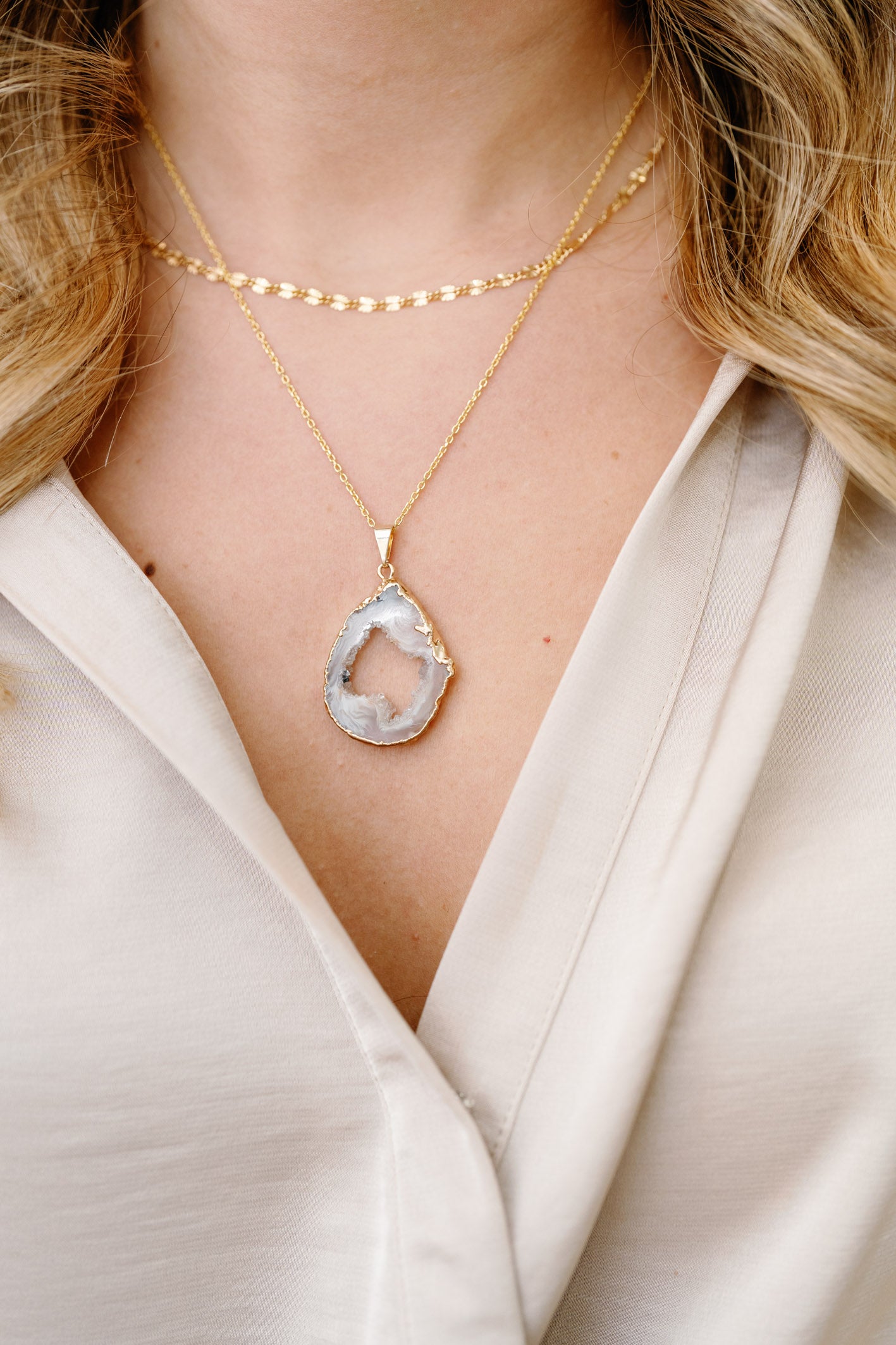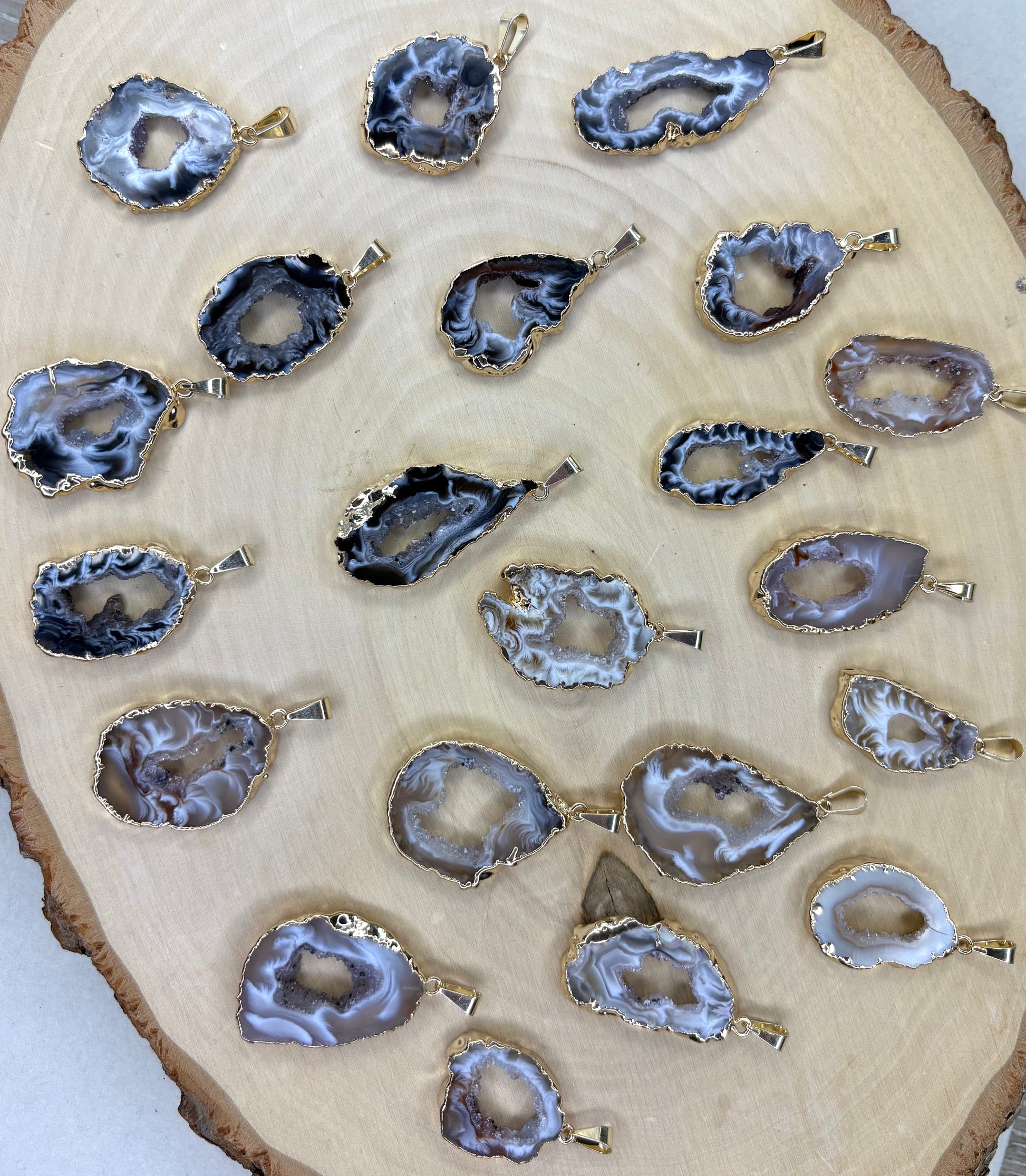 Shop now to discover the elegance of our Geode Pendants with 18K gold hand-painted edges, available in Dark Color Geode or Light Color Geode, and add a unique, natural touch of luxury to your jewelry collection.