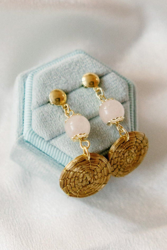 Golden Grass Mandala Earrings with Rose Quartz — Handwoven in Brazil with 18K Gold Plated Accents