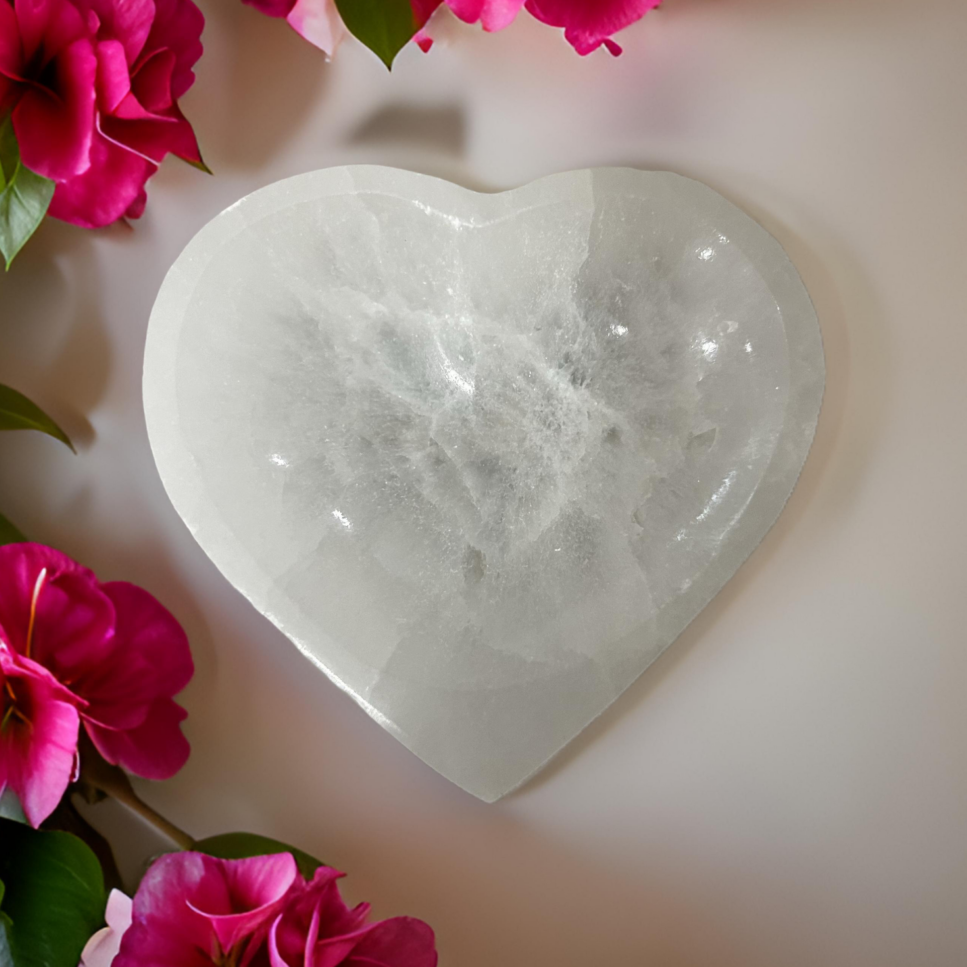 Elevate your space and protect your precious jewelry with our Hand Carved Heart-Shaped Selenite Stone Bowl. Shop now to experience the beauty and benefits of this must-have decor item!
