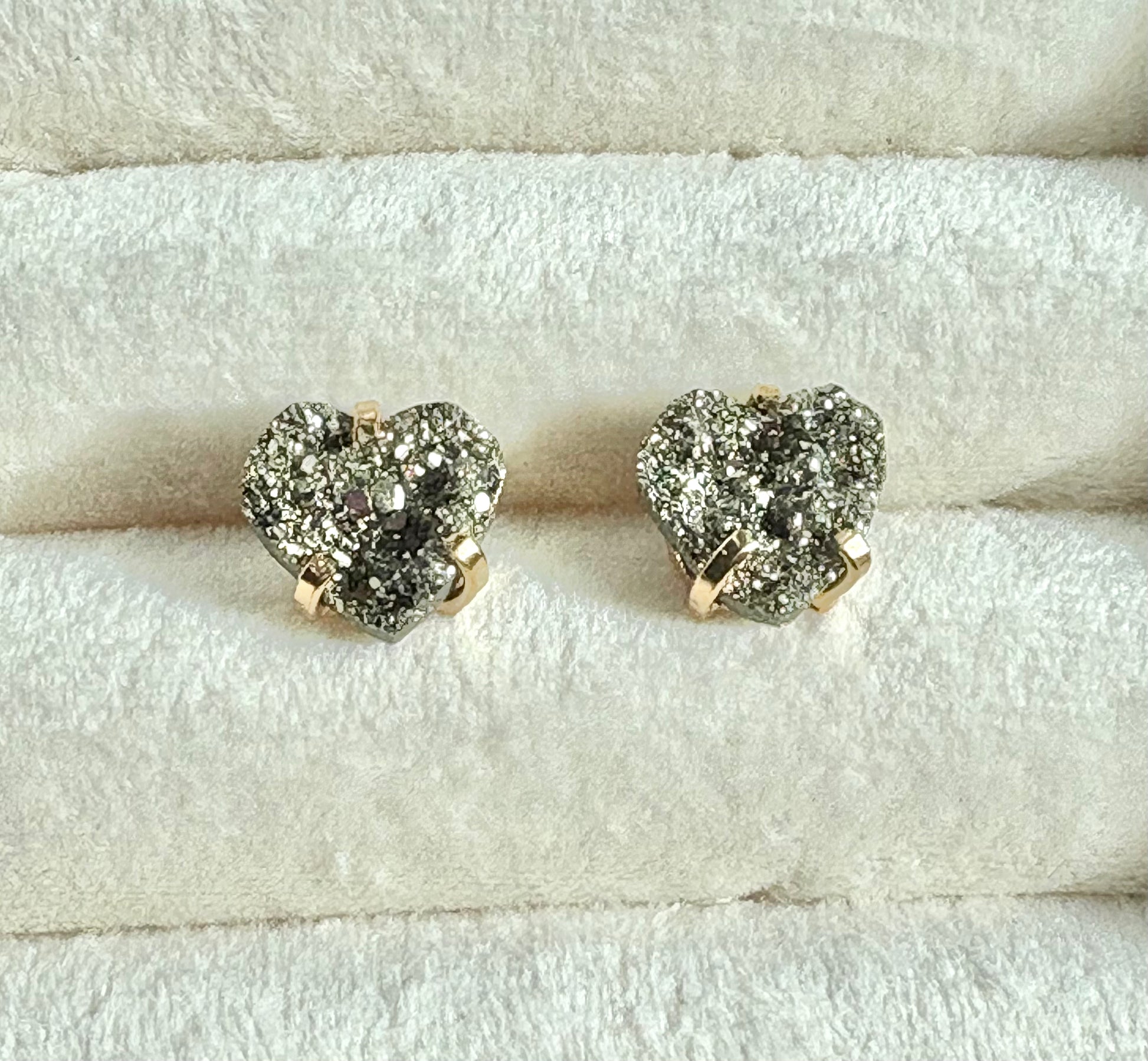 Complete your look with our Heart-Shaped Pyrite Stud Earrings, a perfect match for the Handmade Heart-Shaped Pyrite Open Bangle Bracelet. These elegant earrings feature beautifully hand-cut pyrite stones in the shape of hearts, set in a luxurious 18k gold-dipped finish. Designed for both style and comfort, these earrings are hypoallergenic and free from heavy metals, making them ideal for sensitive ears.