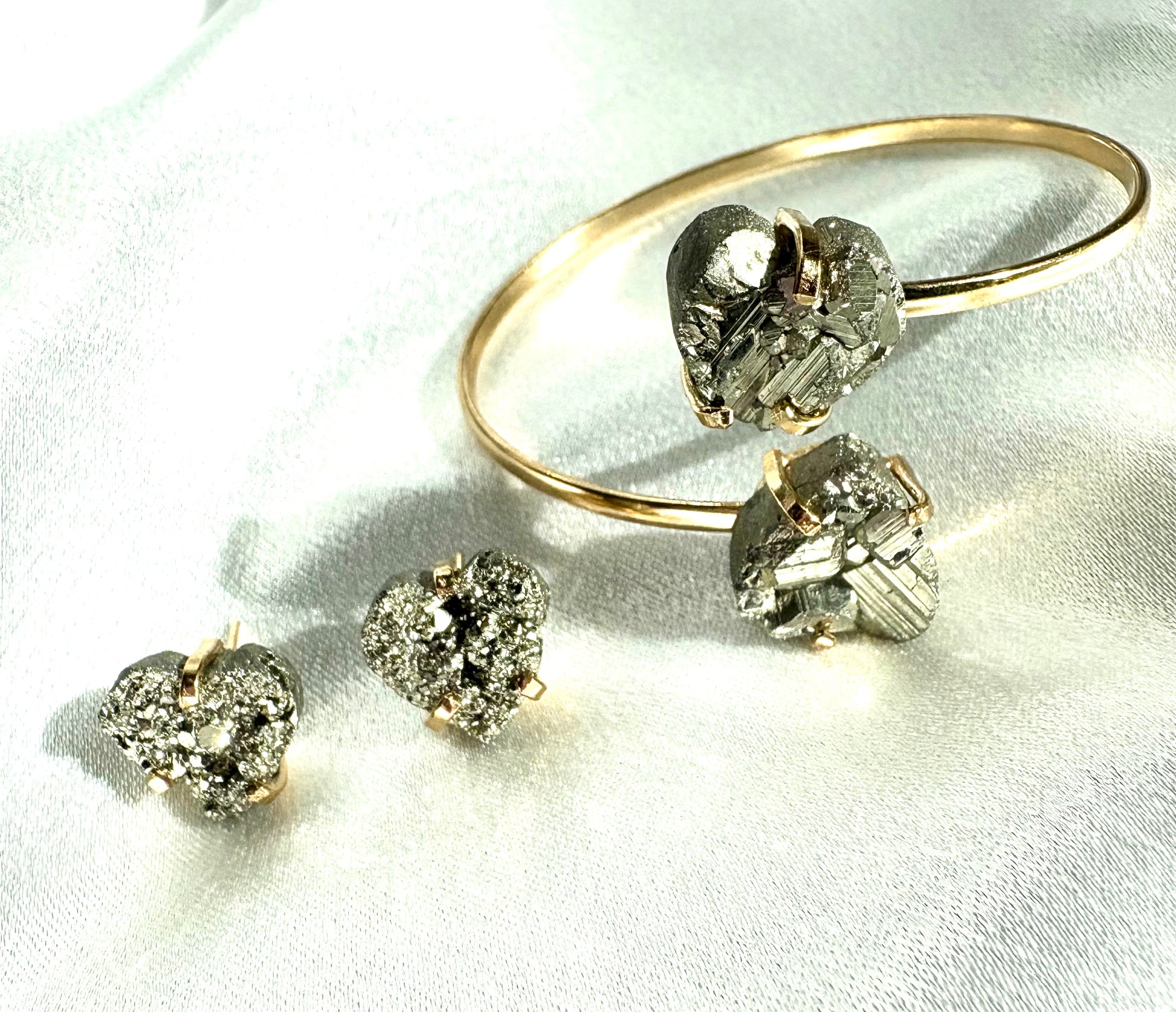 These Heart-Shaped Pyrite Stud Earrings make a beautiful and meaningful addition to any jewelry collection. Their stunning design and beneficial properties perfectly complement the matching Heart-Shaped Pyrite Bangle Bracelet, creating a cohesive and elegant look.