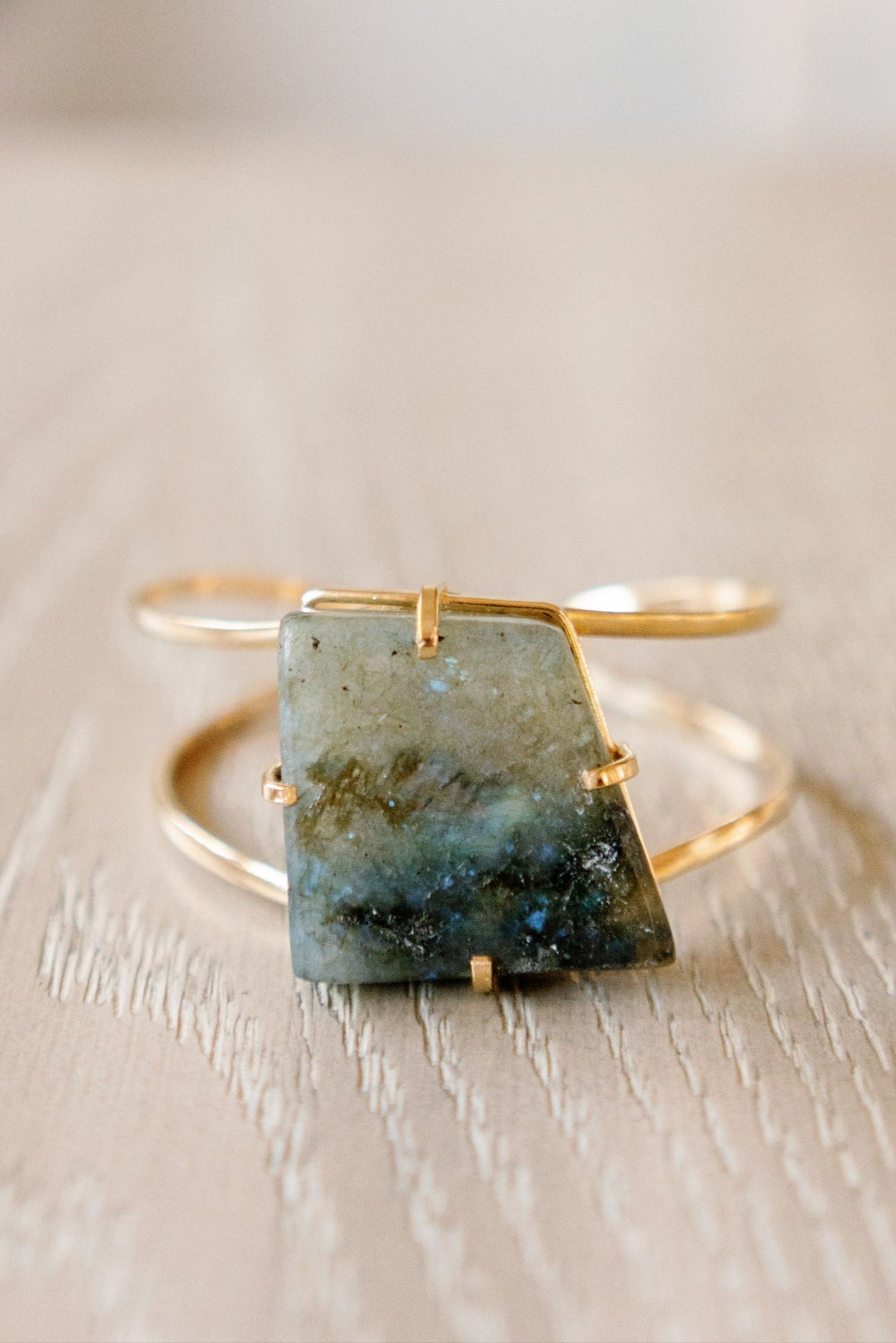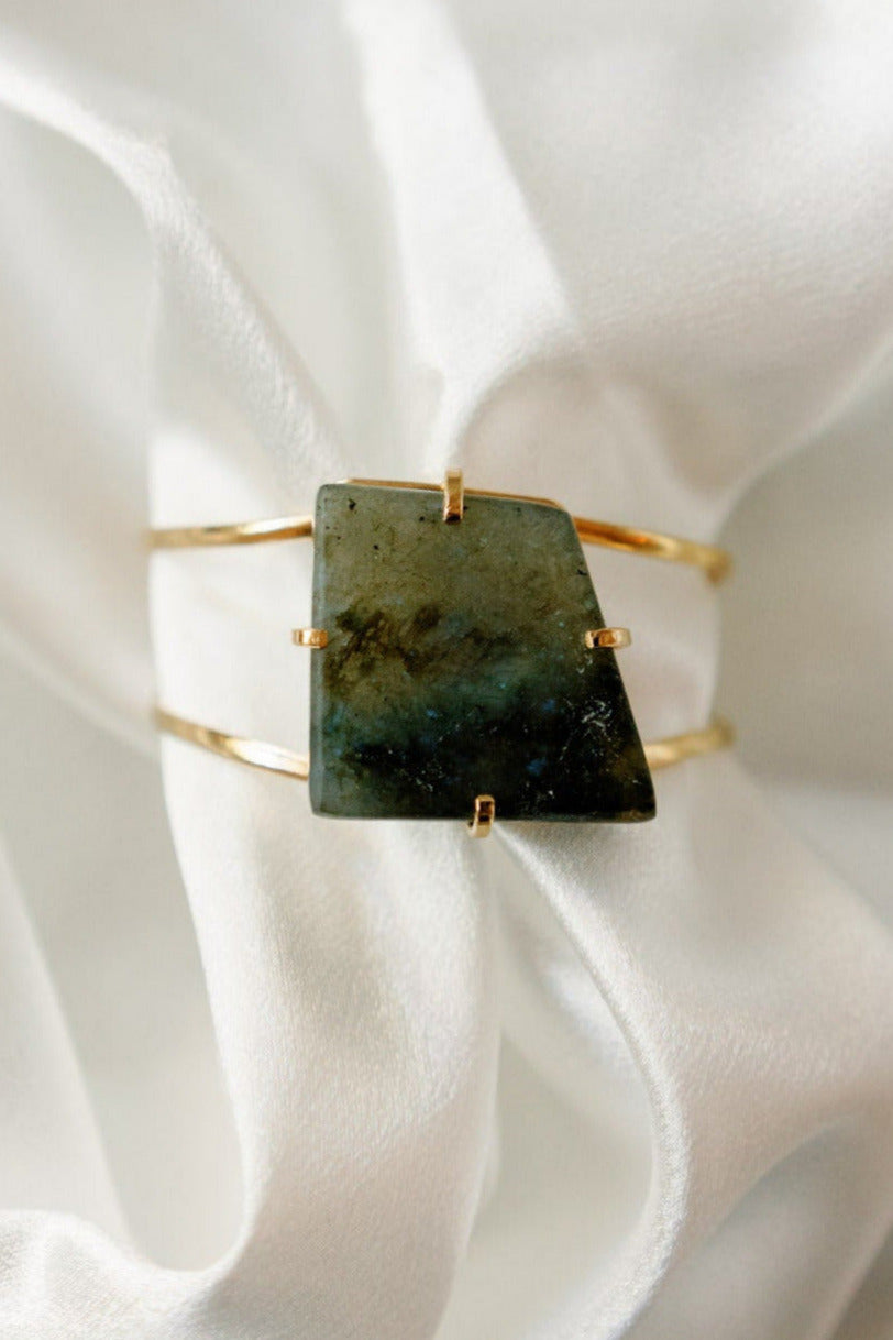 Labradorite Cuff Bracelet — Genuine Natural Stone, 18K Gold Plated, Adjustable Statement Jewelry