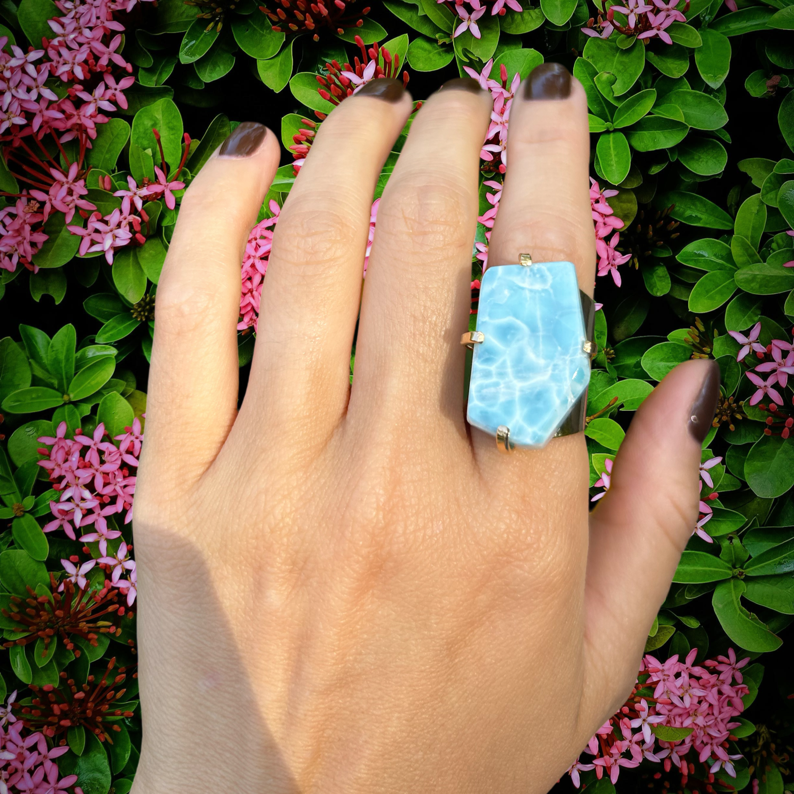 About Larimar: Larimar is a rare and enchanting gemstone, exclusively found in the Dominican Republic. Known for its calming blue hues, it is believed to promote peace, emotional healing, and self-expression, making this ring not just a beautiful accessory but also a source of positive energy.