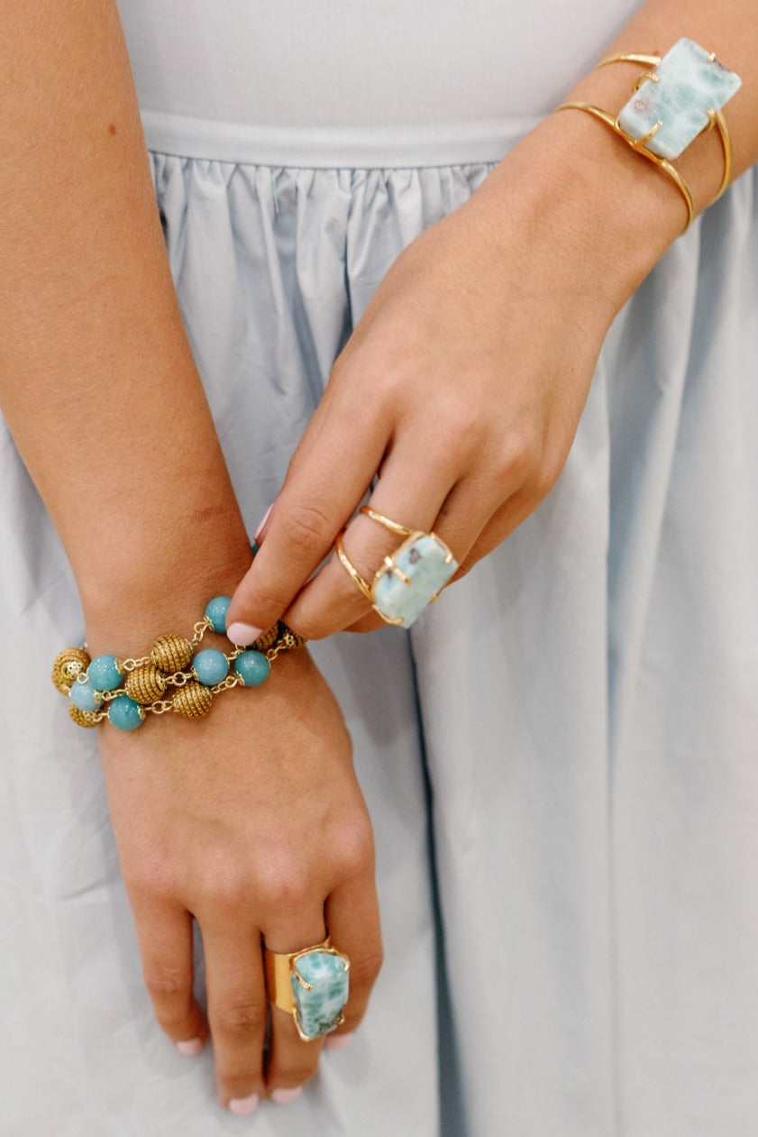 Larimar Cocktail Cuff Ring — Genuine Caribbean Gemstone, 18K Gold Plated, Adjustable Statement Jewelry