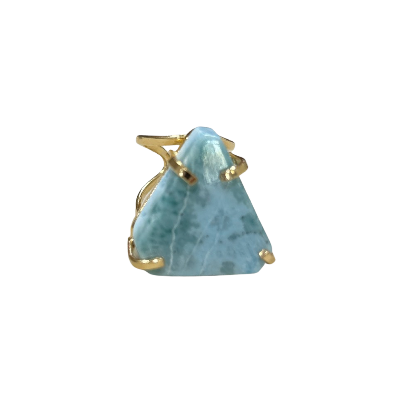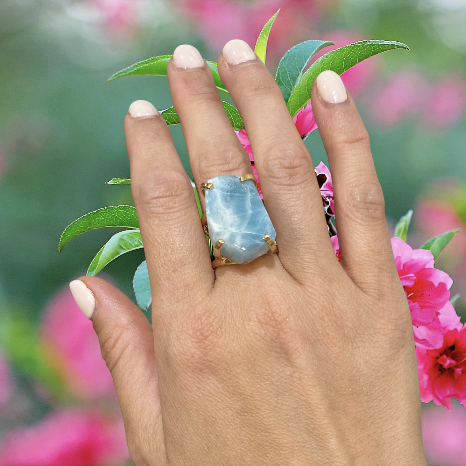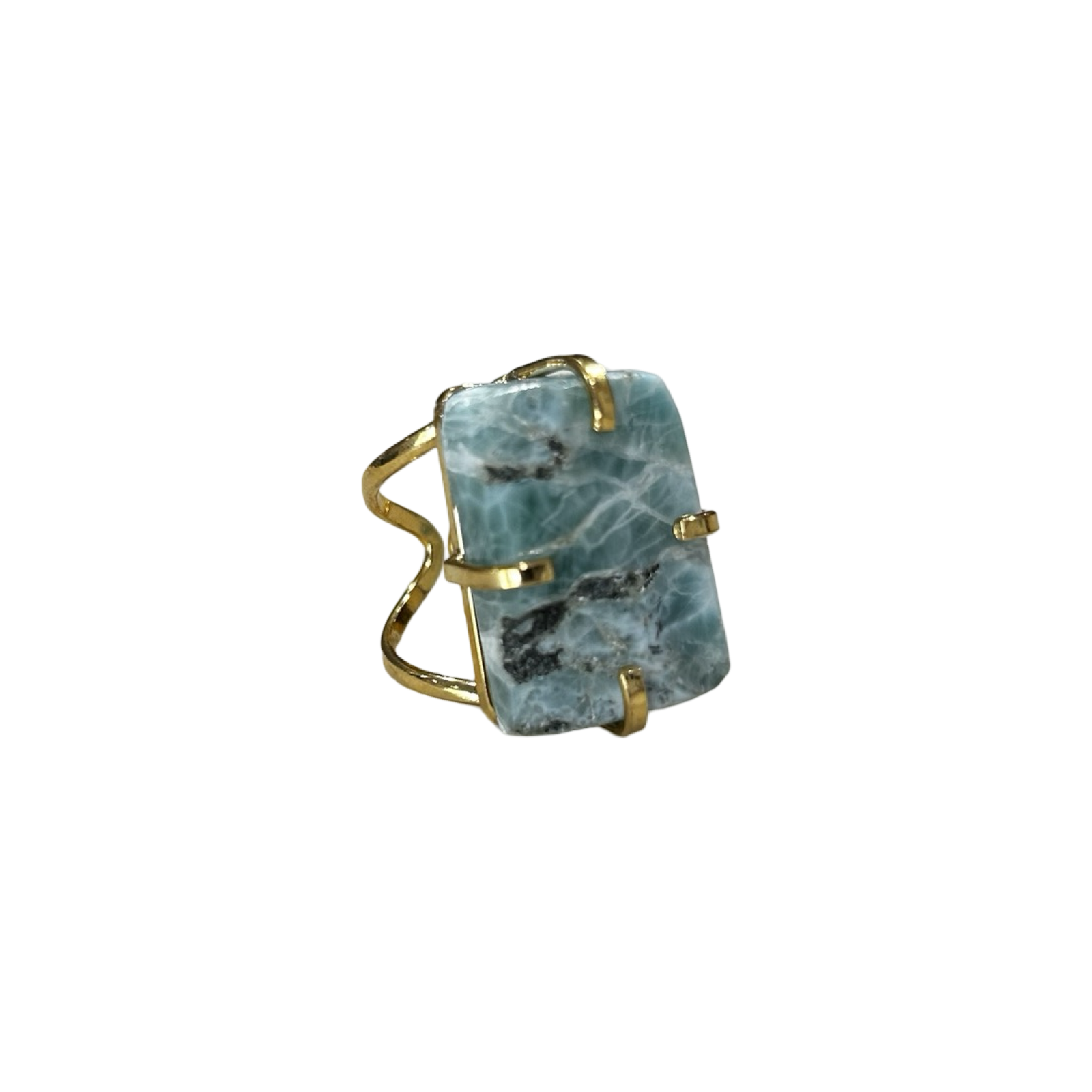 Elevate your accessory game with our 18K Gold Dipped Larimar Statement Open Cuff Ring. Shop now to embrace the rarity and beauty of this extraordinary gemstone!