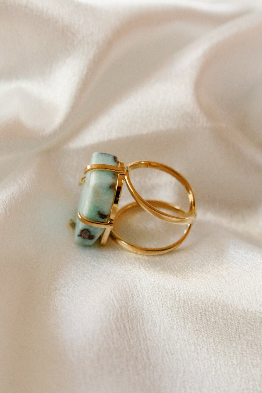 Make a bold impression with our Larimar Statement Open Cuff Ring, a stunning piece that effortlessly combines elegance and uniqueness. This adjustable ring is dipped in 18K gold, providing a luxurious touch while ensuring a comfortable fit for any finger size.