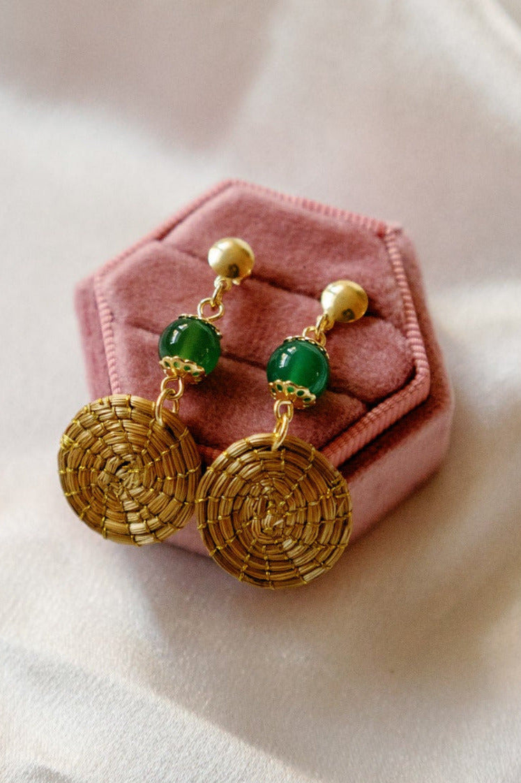 Golden Grass Mandala Earrings with Green Agate — Handwoven in Brazil with 18K Gold Plated Accents