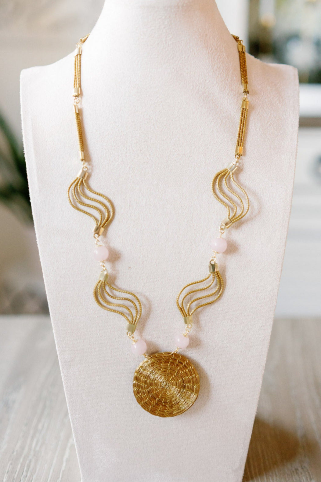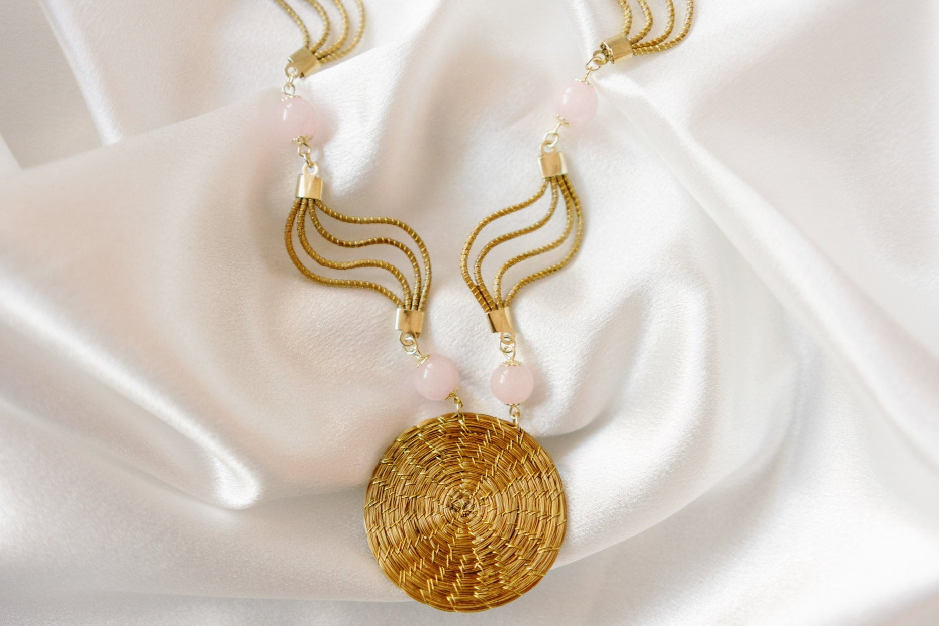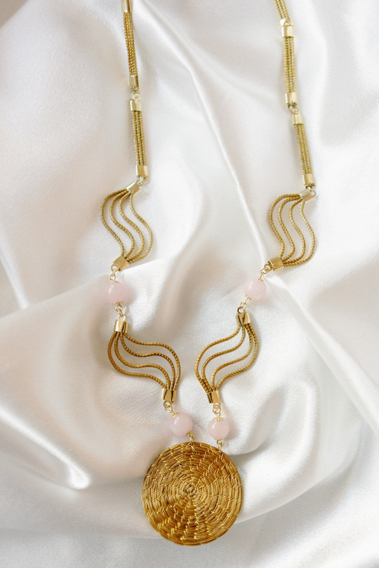 Mandala Waves Necklace — Handwoven Golden Grass with Rose Quartz & 18K Gold Plated Accents