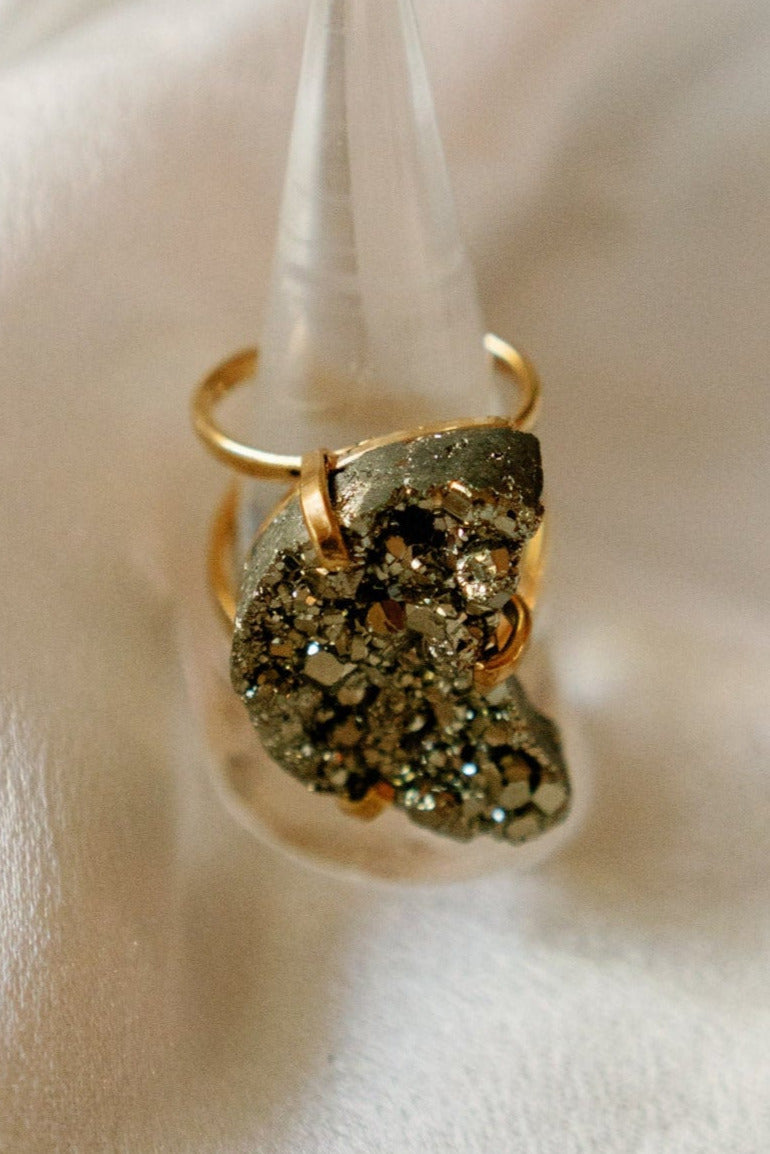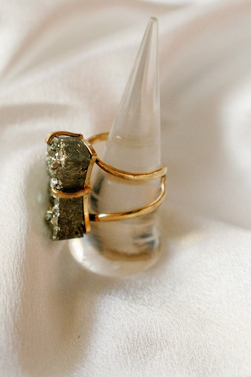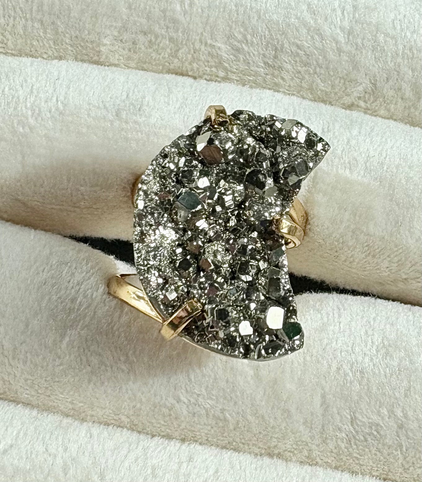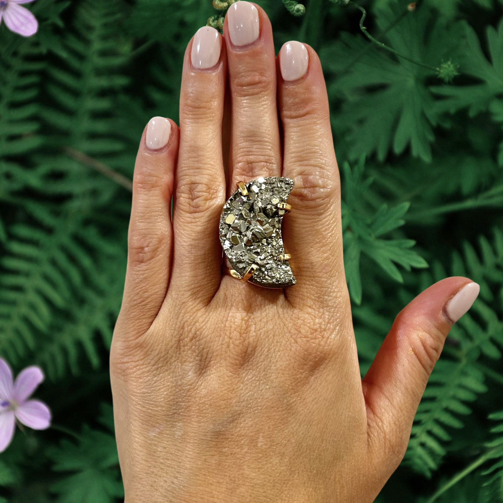 Embrace the celestial allure and empowering energy of our Moon-Shaped Pyrite Cocktail Ring. Order now to make a bold, sophisticated statement with this unique, eye-catching piece.