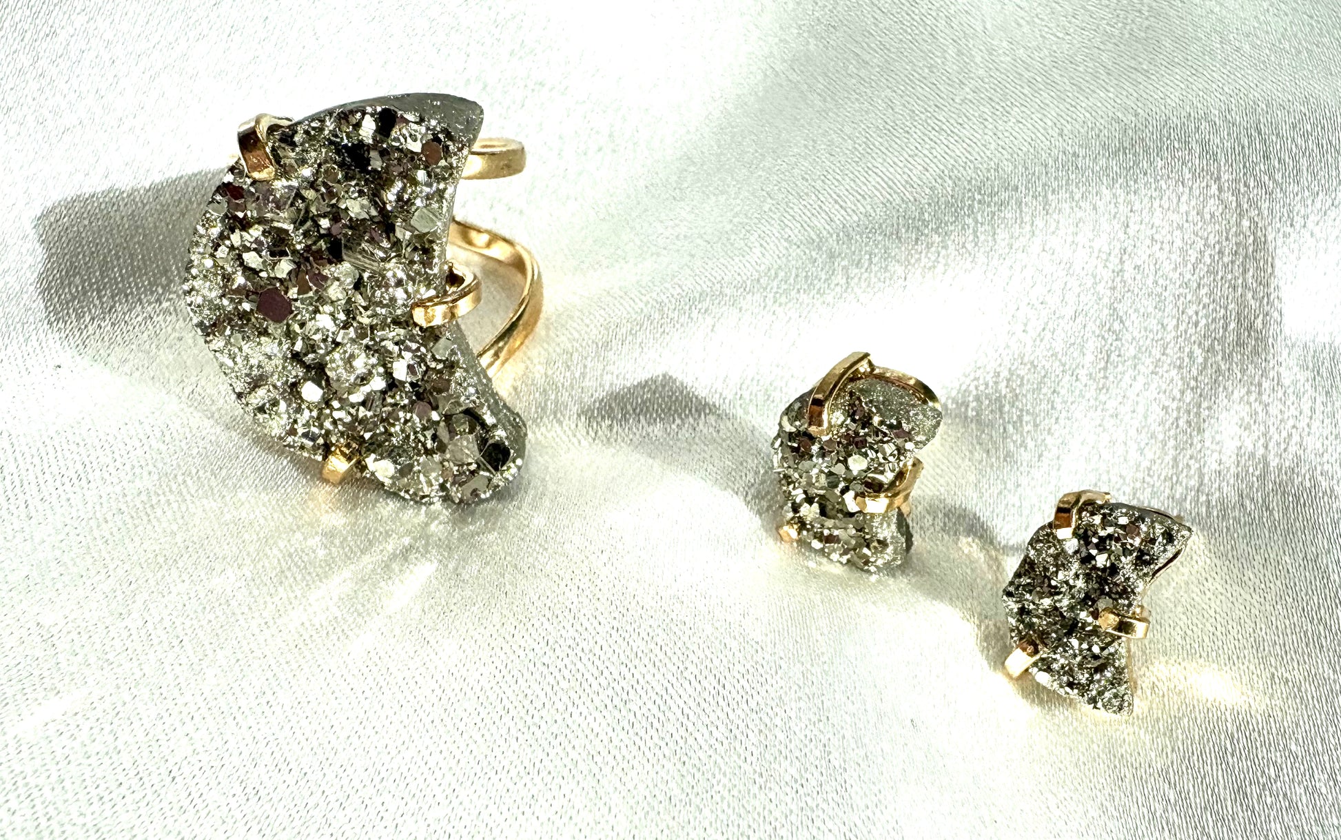 The Moon-Shaped Pyrite Stud Earrings are the perfect accessory to add a celestial touch to any look. Whether worn alone or paired with the matching Moon shaped ring and bracelet! these earrings make a beautiful statement of elegance and empowerment.
