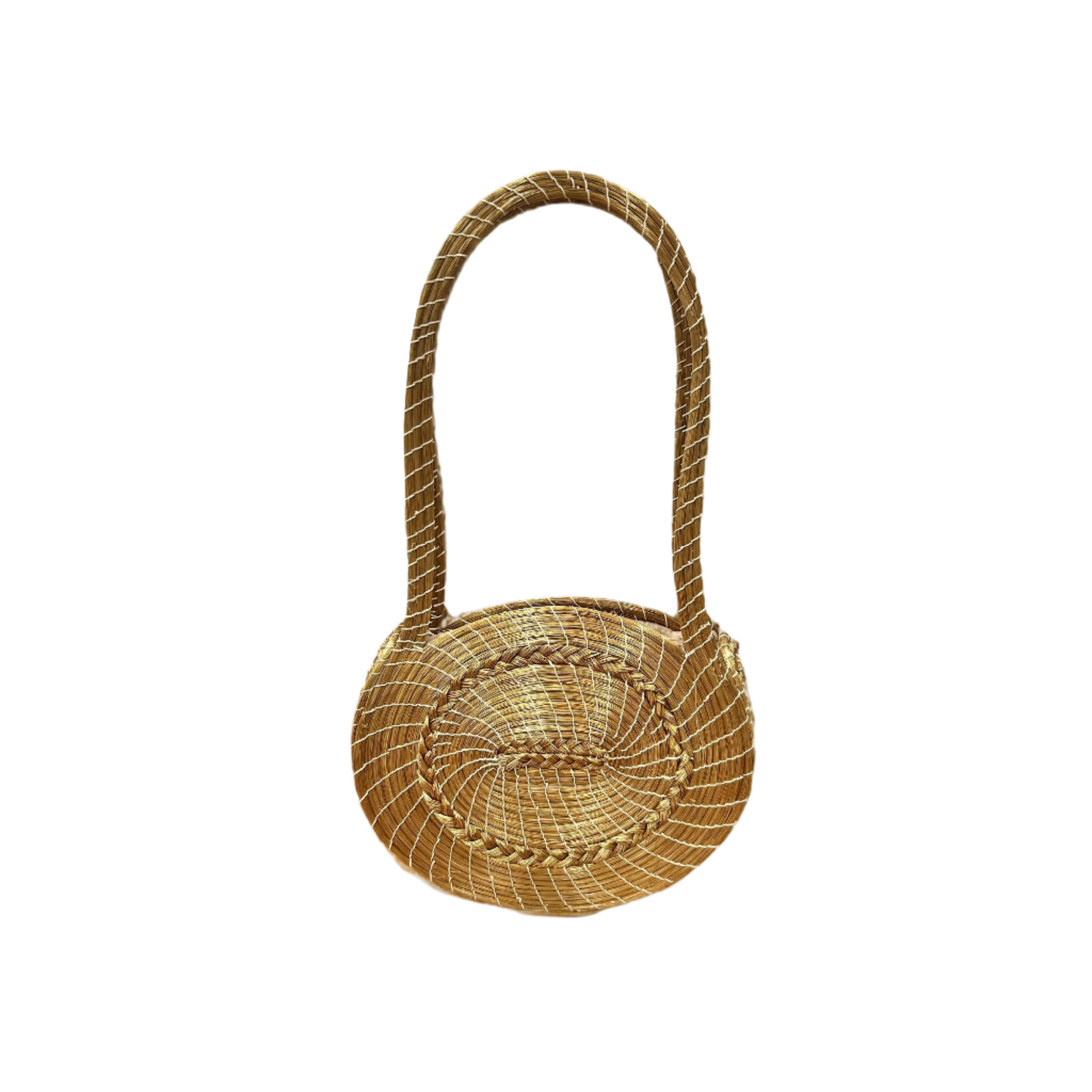 Round Golden Grass Bag with Braided Center and Long Handle.