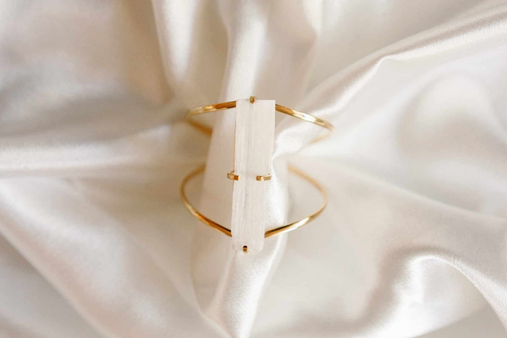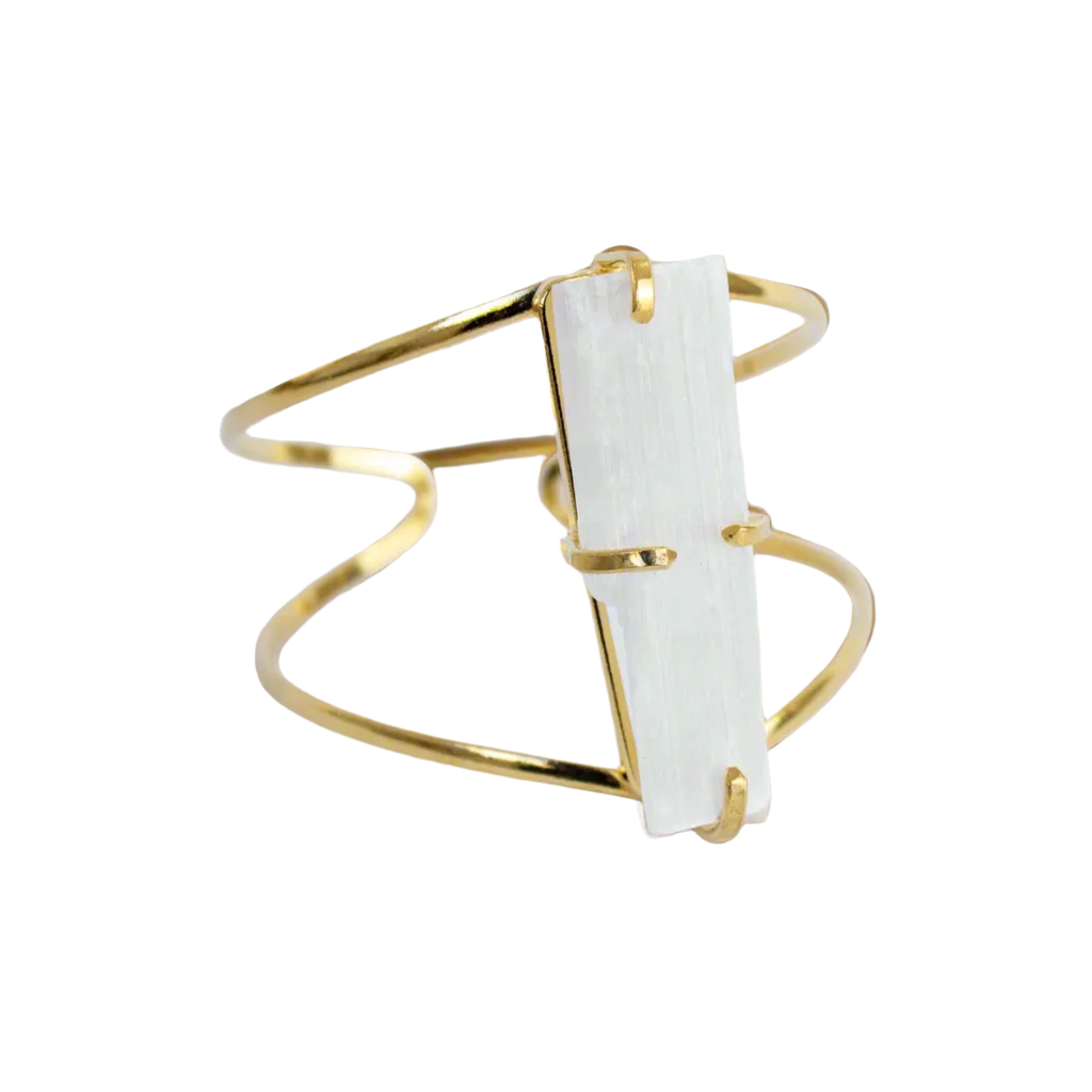 This Selenite Bracelet Cuff combines the healing properties of selenite with the luxury of 18k gold, making it a versatile and stylish accessory. Whether you're wearing it to promote clarity and calm or simply to add a chic touch to your look, this handmade cuff is the perfect addition to any jewelry collection. The open cuff design offers a comfortable fit and an adjustable size, making it suitable for any wrist.