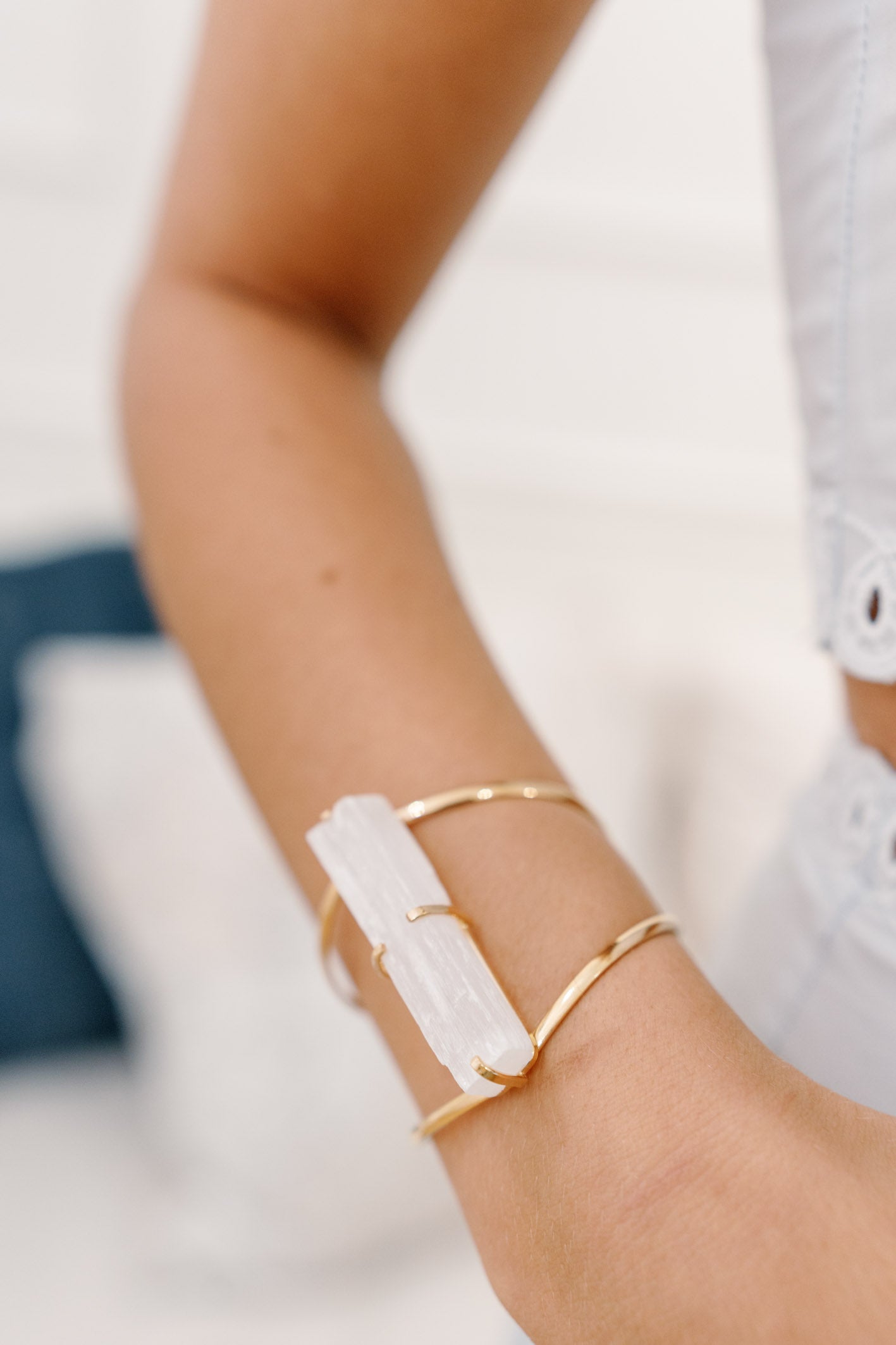 Elevate your style and energy with our Selenite Bracelet Cuff, a luxurious and meaningful piece of jewelry that blends natural crystal beauty with modern elegance. Handcrafted in Brazil, this stunning cuff features a selenite crystal known for its calming and purifying properties, beautifully encased in 18k gold electroplating for a sophisticated and durable finish. The bracelet is hypoallergenic, making it a perfect choice for those with sensitive skin.
